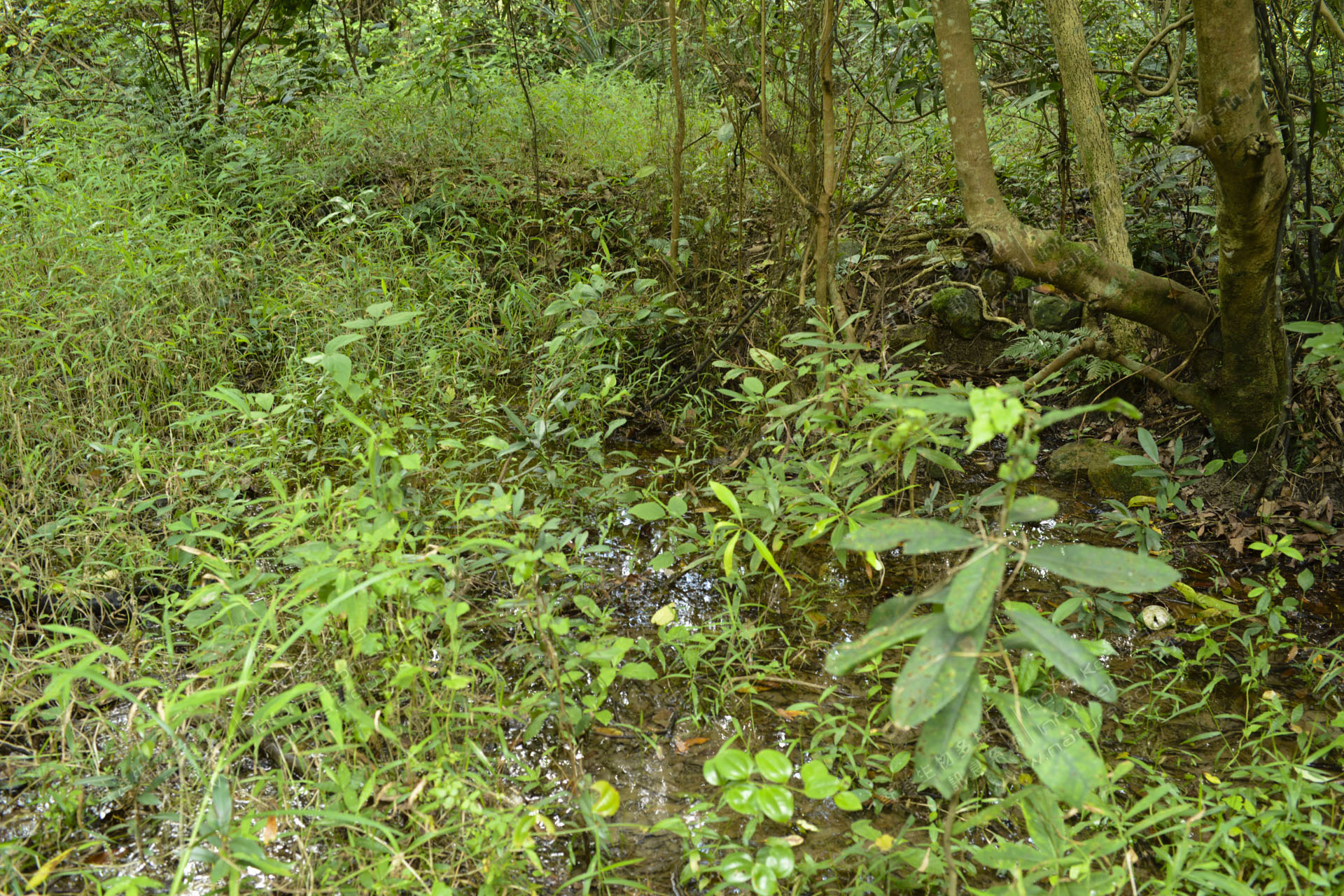 水塘附近皆是次生林,較近水塘的是植樹計劃種下的白千層樹。次生林中有淡水河溪,為各種魚類提供住處。