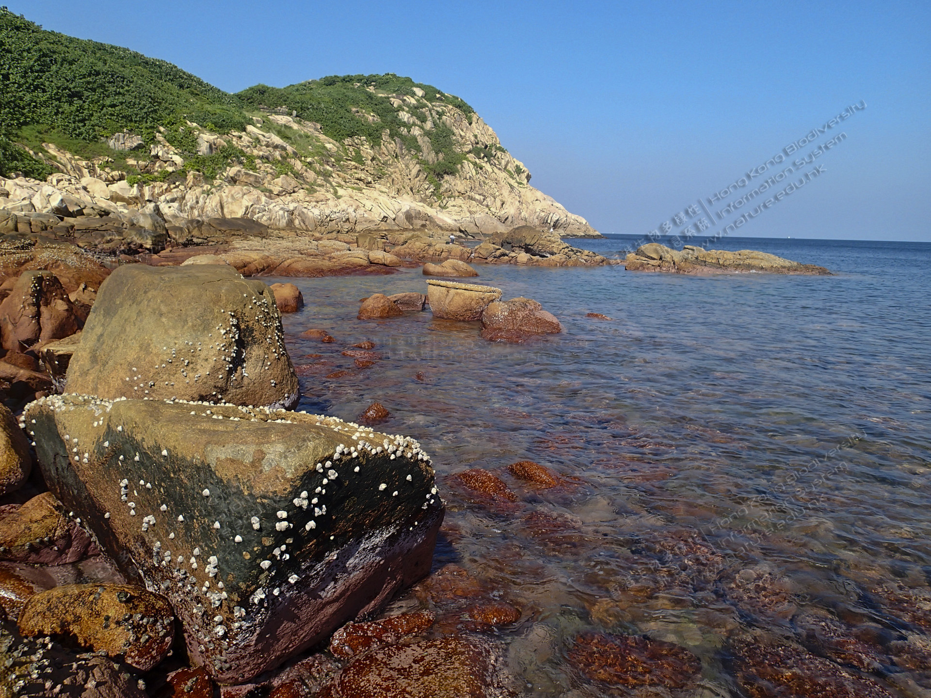Shek O is located in the southeastern part of Hong Kong Island, nearby the bridge linking Shek O Headland and Tai Tau Chau. The northern side is a more sheltered pebbly shore with gentle slope and smaller wave splash. The southern side is a typical exposed rocky shore with strong waves impounding the hard substratum. Basically, most of the common rocky shore organisms can be found in Shek O. During field study, zonation of species along the vertical gradient can be observed and also the difference of community between sheltered shore and exposed shore is worth comparison.