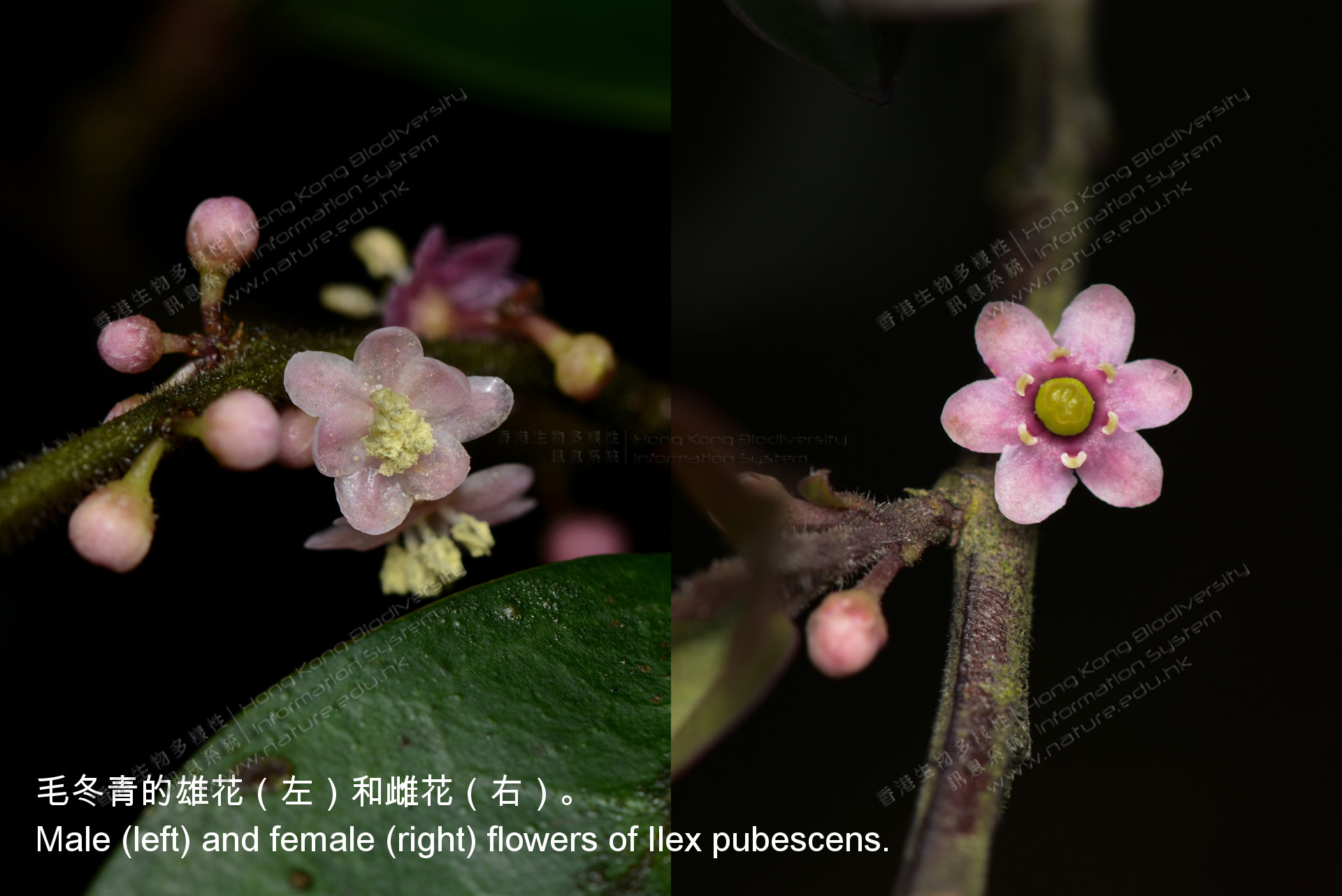 When a plant species has the male and female sex organs (male and female flowers) growing on different individuals. For example, Downy Holly (Ilex pubescens) is dioecious, and has either stamen or pistil on the same shrub.