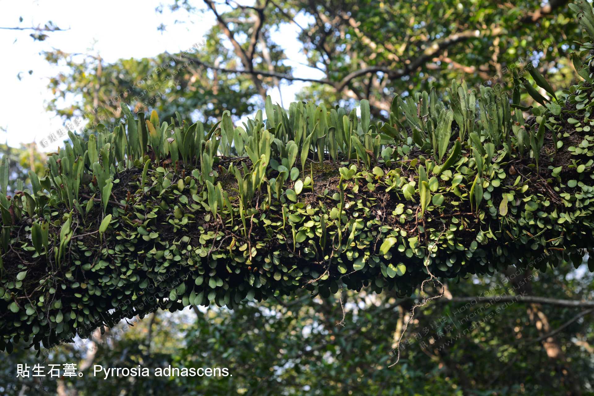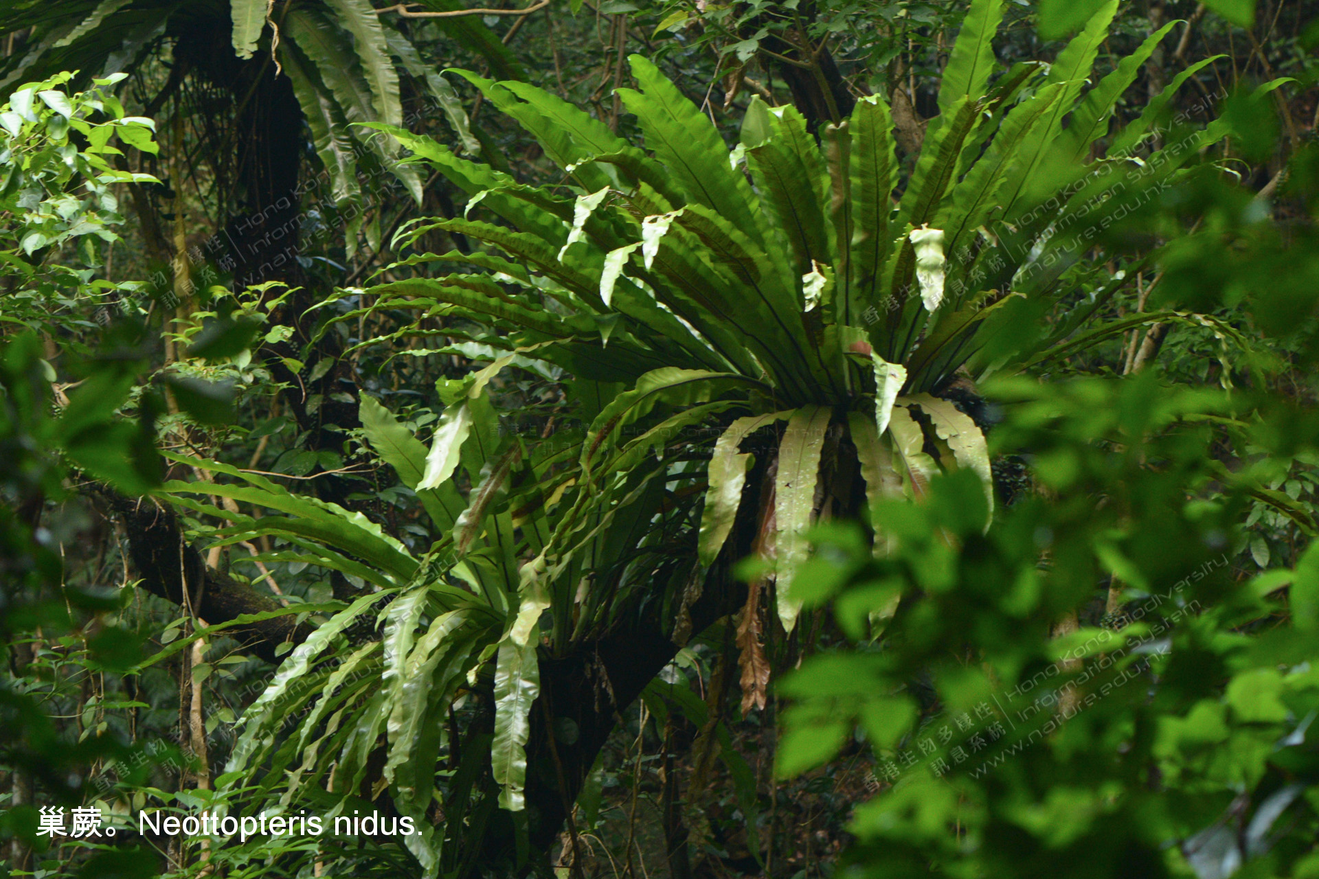 Epiphytes are plants that grow on other plants for support. They do not absorb nutrients from the host plants because they can carry out photosynthesis to produce food for themselves. They can absorb more sunlight by climbing on other plants to increase their competitiveness. Nest fern (Neottopteris nidus) is an epiphyte commonly found in Hong Kong.